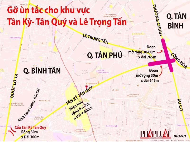 Theo ông Ninh, tới đây TP sẽ đầu tư 2.606 tỉ đồng để thực hiện hai dự án mở rộng đường Trường Chinh và Tân Kỳ Tân Quý. Cụ thể, sẽ mở rộng đường Trường Chinh đoạn từ đường Cộng Hòa đến đường Âu Cơ dài 765 m, rộng 30 m (hiện nay rộng khoảng 10-12 m) cho sáu làn xe lưu thông với kinh phí 278 tỉ đồng. Cùng lúc sẽ nâng cấp, mở rộng đường Tân Kỳ Tân Quý đoạn từ đường Cộng Hòa đến đường Lê Trọng Tấn, dài 644,8 m, rộng 30 m (hiện nay rộng khoảng 8 m) cho sáu làn xe với vốn xây dựng 96 tỉ đồng.