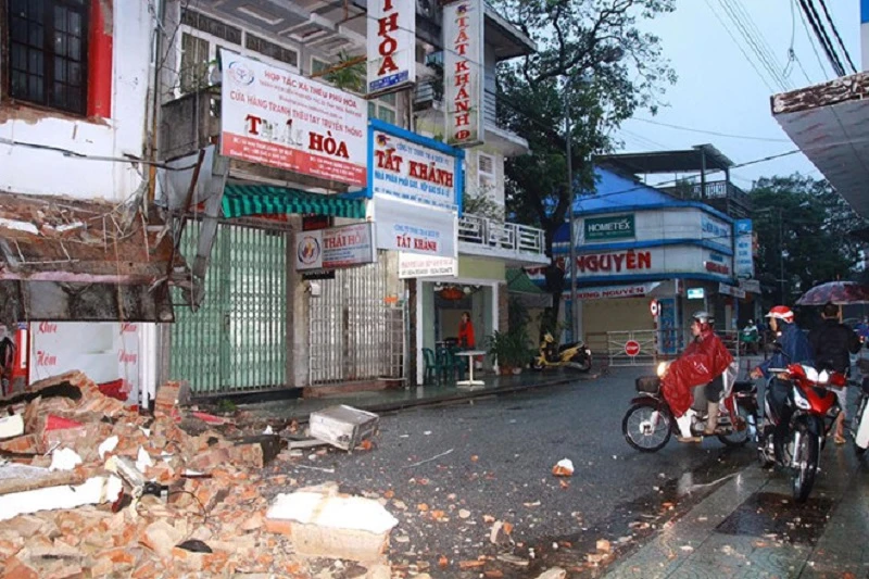 Nhiều vật dụng, mảng gạch đá lớn văng tứ tung ra đường.