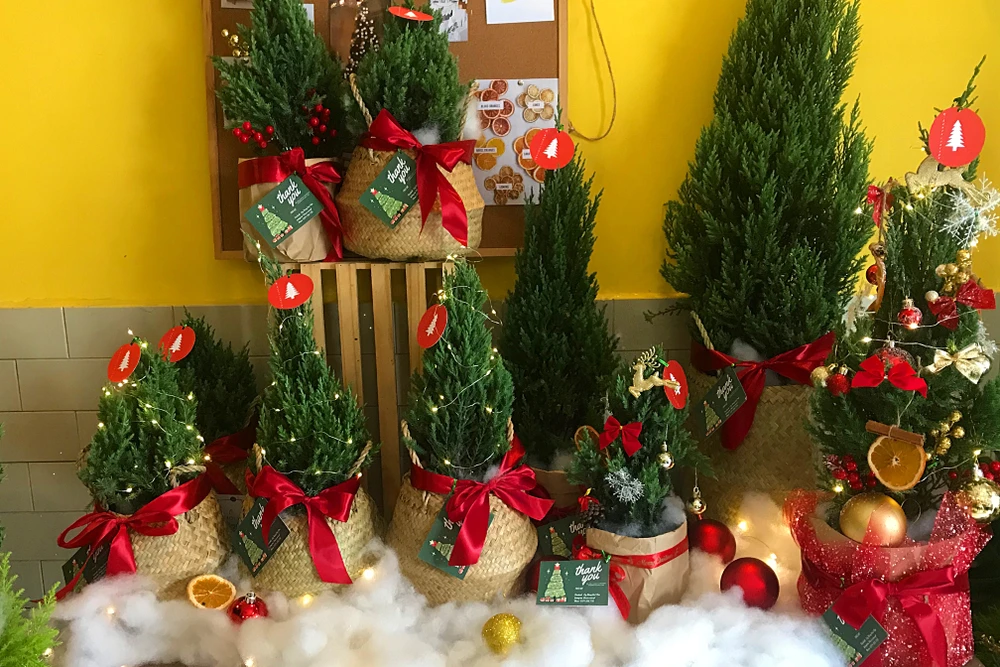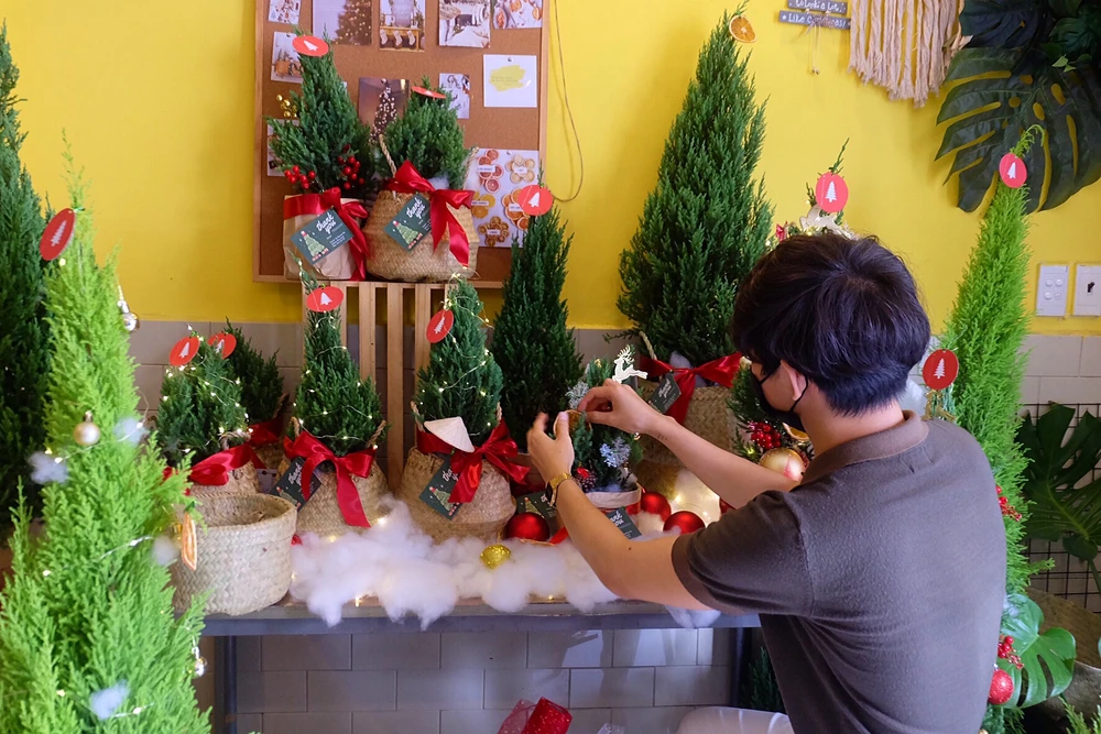 Chậu cây sơn tùng được trang trí hệt như cây thông Noel thu nhỏ cuốn hút khách hàng đặt mua dịp Giáng sinh. Ảnh: TÚ NGÂN - ANH THƯ