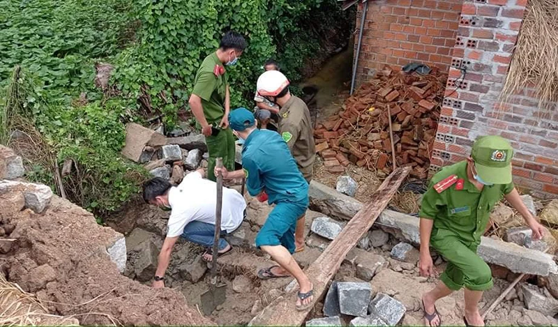 Đá đất của tường rào sập xuống đè chết ông Phú tại chỗ. Người dân địa phương cùng lực lượng chức năng phải đào bới đất đá để đưa thi thể ông Phú ra ngoài.