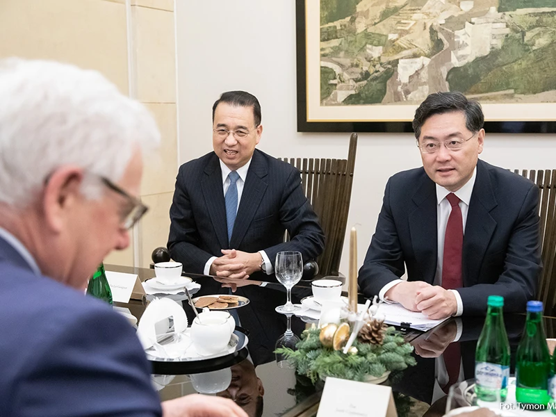 Thứ trưởng Ngoại giao Trung Quốc Tần Cương (phải) trong một cuộc hội đàm với cựu Ngoại trưởng Ba Lan Jacek Czaputowicz (trái) hồi tháng 12-2019.
