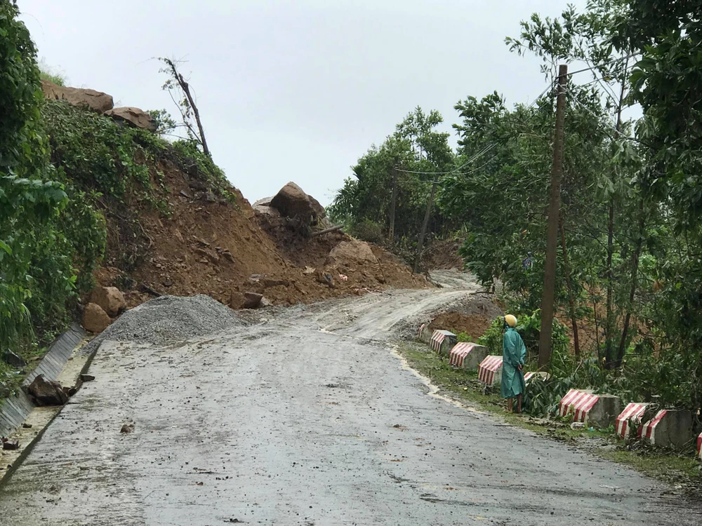 Tảng đá lớn rơi xuống sát đường 40B gây chia cắt Trà Leng.