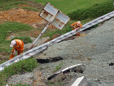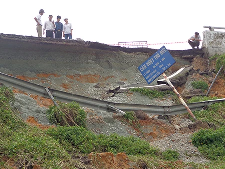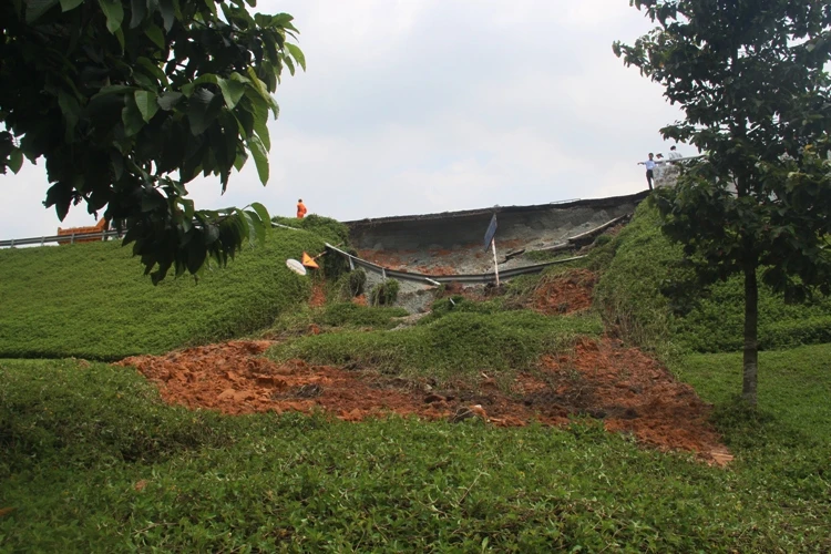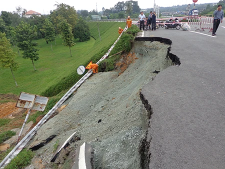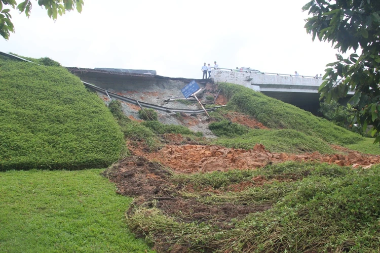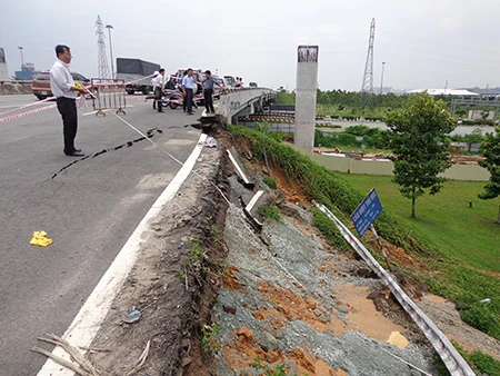 Trao đổi với PV, một cán bộ thuộc Khu quản lí giao thông đô thị số 2 cho biết mấy hôm vừa qua trời mưa rất lớn. Vì thế, nguyên nhân vụ sạt lở có thể do lượng nước mưa trên cầu đổ dồn xuống hai bên taluy.