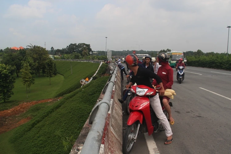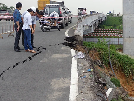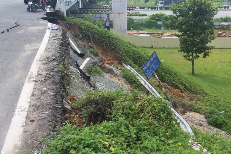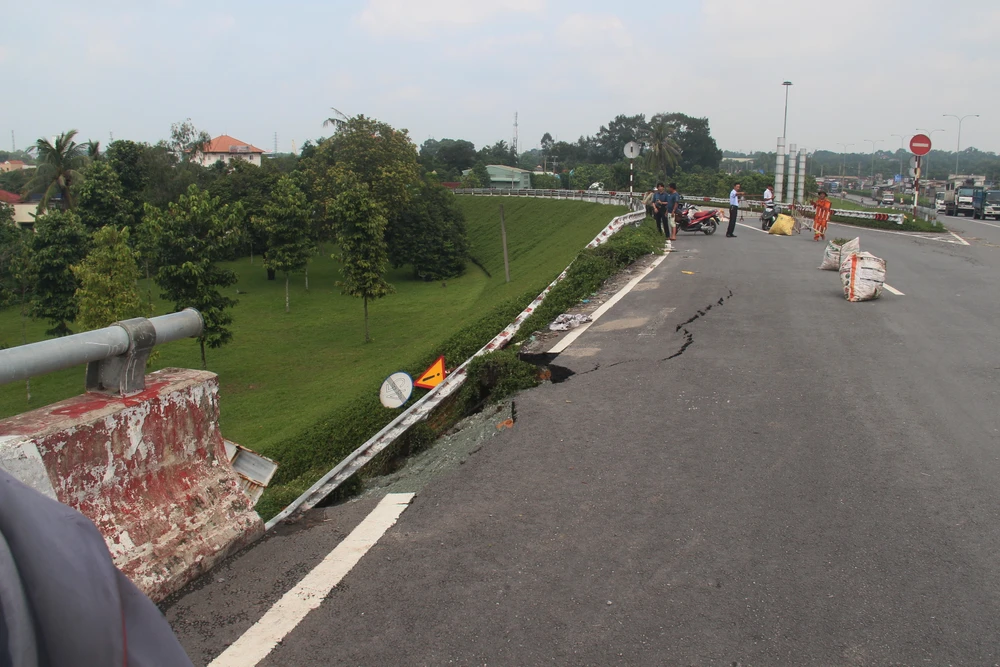 Ghi nhận tại hiện trường, mép cầu vượt Thủ Đức (theo hướng về Suối Tiên) bị sạt lở một đoạn taluy dài hơn 20 mét, kéo theo một đoạn rào thép. Mặt đường xuất hiện nhiều vết nứt. Đất đá bị đổ xuống khu vực thảm cỏ bên dưới.