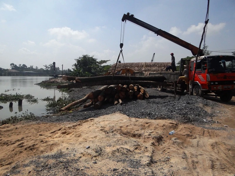 Theo ghi nhận của PV Pháp Luật TP.HCM, có nhiều cây dừa được tập kết để đóng cọc, hạn chế tình trạng sạt lở tiếp diễn.