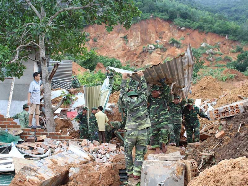 Lực lượng chức năng đang giúp người dân san dọn lại nhà cửa, đất đá sau vụ sạt lở núi kinh hoàng. Ảnh: TL