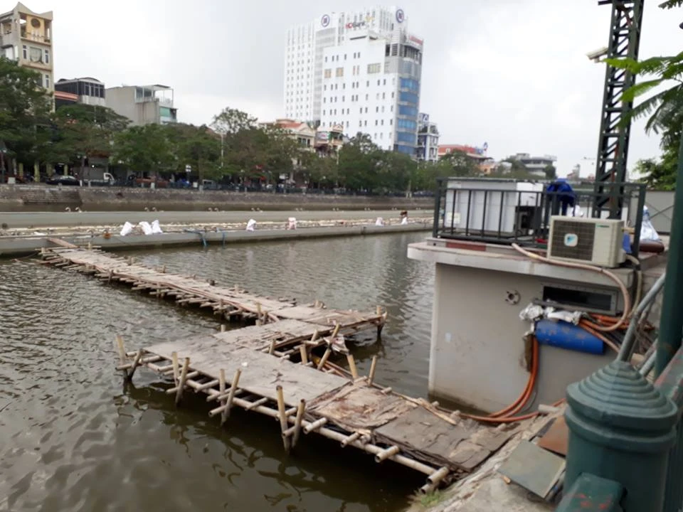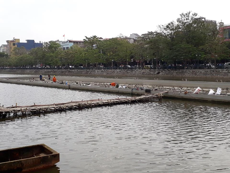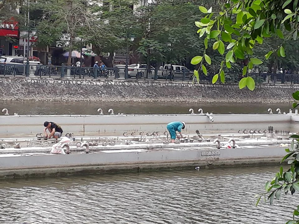 Các công nhân đang gấp rút di dời công trình này khỏi hồ Tam Bạc