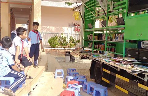 Một ngày gần cuối tháng 4-2016, tôi đến Trường Tiểu học Bình Thạnh và tình cờ gặp lúc chiếc xe thư viện di động đến phục vụ. Thấy xe đến, hàng chục em học sinh háo hức vây quanh những chiếc kệ sách từ thùng xe hạ xuống và lấy những cuốn sách đọc ngấu nghiến. Nhiều em khác thì chăm chú nhìn chiếc tivi 32 inch gắn trên thành xe.