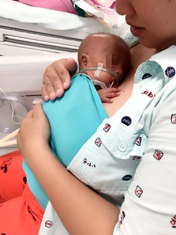 Hiện tại, bé đã được 9 tuần tuổi, cân nặng được 1500g. Bé đang được hỗ trợ thở áp lực dương liên tục qua mũi (NCPAP), đã ngưng điều trị kháng sinh, ăn sữa mẹ hoàn toàn qua ống thông dạ dày, tiếp tục được mẹ ấp Kangaroo tại khoa HSSS.
