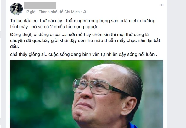Trên Facebook của Lê Lộc, nghệ sĩ cải lương Lê Tín cũng đã phản hồi: “Như chú đã từng nói sau chương trình phát sóng, người bị chỉ trích là Ba con. Cũng may là ba con đã nói lên sự thật, con chịu khó đọc hết comment của khán giả xem họ nói gì. Chú chỉ tiếc cho mẹ con, khơi dậy quá khứ rồi bây giờ cả nhà phải chịu sự dèm pha của dư luận”.