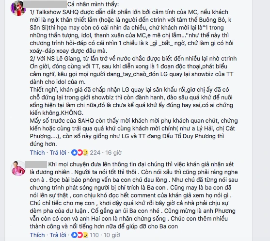 Ngược lại phản hồi chia sẻ trên Facebook của Lê Lộc, trong Facebook của nghệ sĩ Lê Giang, hầu hết những phản hồi lại là phản ứng về chuyện Lê Giang đã kể trong Sau ánh hào quang, phản ứng chương trình.