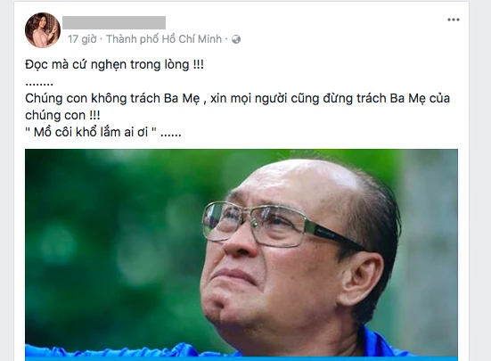 Mới nhất, trên Facebook của mình, diễn viên Lê Lộc, con của nghệ sĩ Lê Giang và Duy Phương, chia sẻ bài trả lời của cha mình với lời nhắn nhủ: “Đọc mà cứ nghẹn trong lòng!!!... Chúng con không trách Ba Mẹ, xin mọi người cũng đừng trách Ba Mẹ của chúng con !!! “Mồ côi khổ lắm ai ơi"…”.