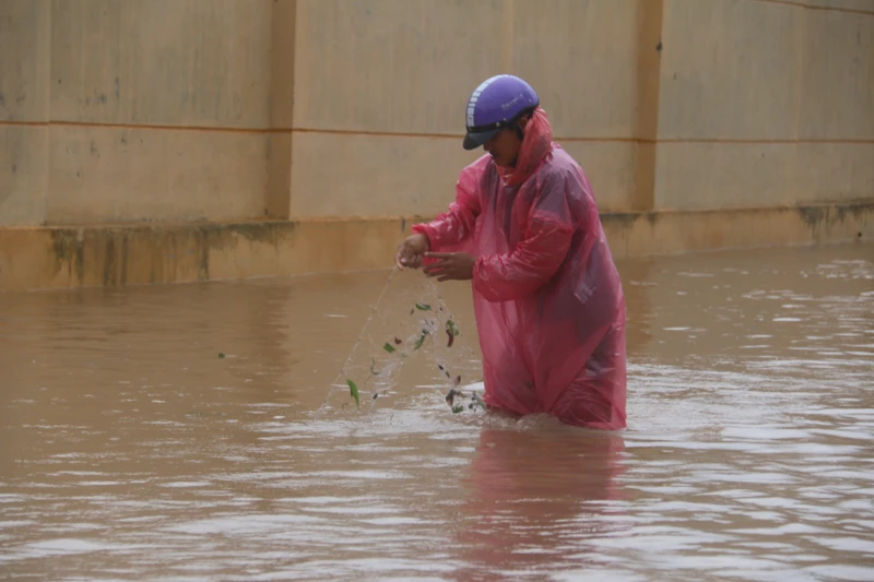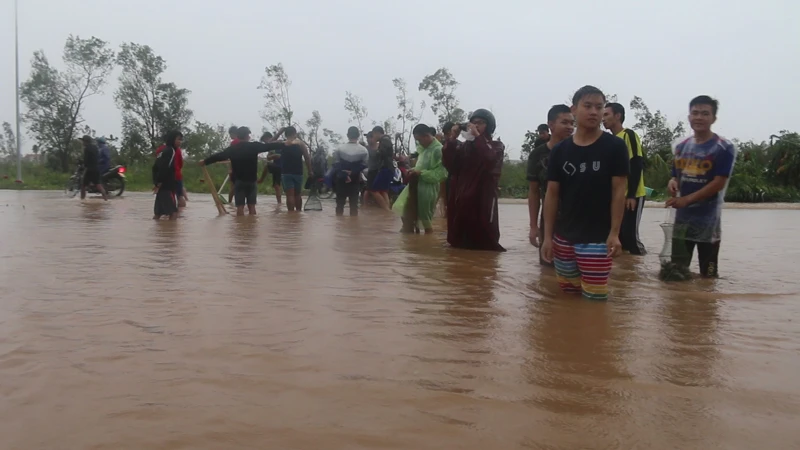 Sau khi cơn bão số 10 quét qua tỉnh Quảng Bình, lượng mưa tại thành phố Đồng Hới mặc dù có giảm nhưng nhiều tuyến phố vẫn bị ngập nặng. Theo ghi nhận, tại tuyến đường Nguyễn Văn Linh, Hữu Nghị… nước ngập sâu đến đầu gối.