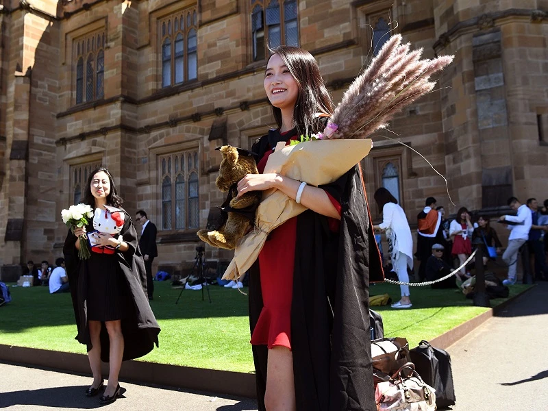 Một sinh viên Trung Quốc (phải) chụp hình sau buổi lễ tốt nghiệp cao học tại Đại học Sydney (Úc) năm 2017. Ảnh: AFP