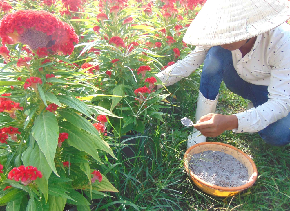 Để lá của hoa mồng gà thêm xanh, chưng cho đẹp mắt trong ba ngày tết, ông Lâm thuê người bón thêm phân đạm. Độ chừng 10 ngày, lá của những chậu mồng gà xanh um sẽ tôn thêm vẻ đẹp rực rỡ của hoa.