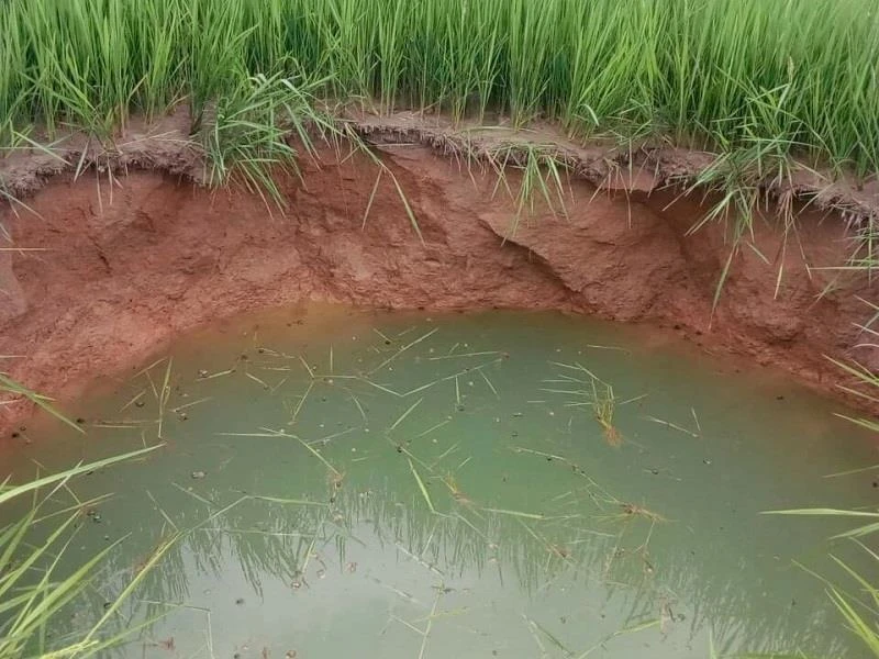 Theo đó, sau trận mưa lớn, bà Trần Thị Lan (54 tuổi, ngụ tại thôn Quật Xá, xã Cam Thành) ra thăm đồng thì phát hiện ruộng lúa của gia đình xuất hiện một hố rất sâu, có hình tròn nên trình báo lên cơ quan chức năng.