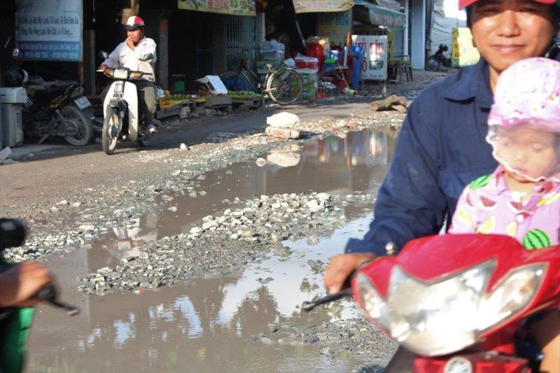 Đoạn đường Nữ Dân Công chỉ dài khoảng 2 km nhưng lại là tuyến đường khiến người dân rùng mình, lắc đầu mỗi khi nhắc đến. Bởi tuyến đường này có hàng chục ổ voi nối dài với nhau mà người dân huyện Bình Chánh vẫn gọi vui là “hồ bơi”.