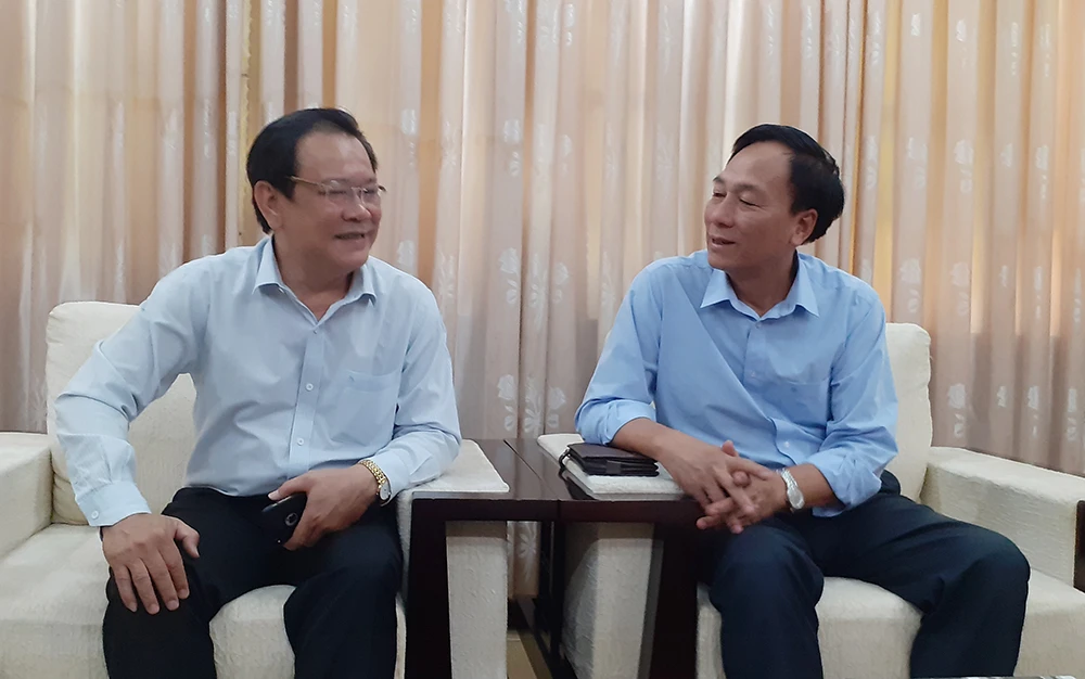 Phó Cục trưởng Cục Đăng kiểm Việt Nam Nguyễn Minh Cương (bên phải) làm việc với Tổng Biên tập báo Pháp Luật TP.HCM Mai Ngọc Phước. Ảnh: HC