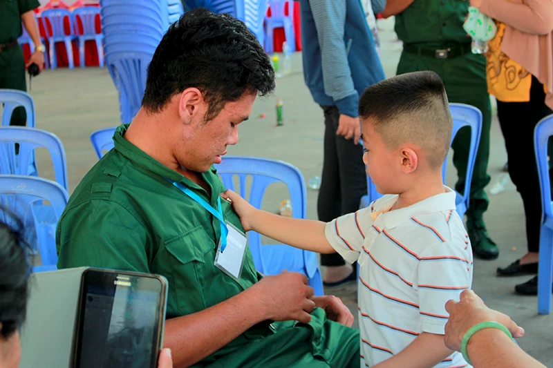 Trong không khí này, rất đông phụ huynh, người thân của các tân binh cũng đã đến, dành những giờ phút ngắn ngủi còn lại trước khi các em lên đường nhập ngũ để trò chuyện, dặn dò.