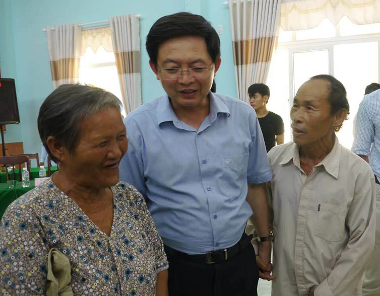 Ông Hồ Quốc Dũng, Chủ tịch UBND tỉnh Bình Định (ở giữa), chia sẻ với người dân xã Mỹ An, huyện Phù Mỹ sau cuộc đối thoại ngày 27-9.