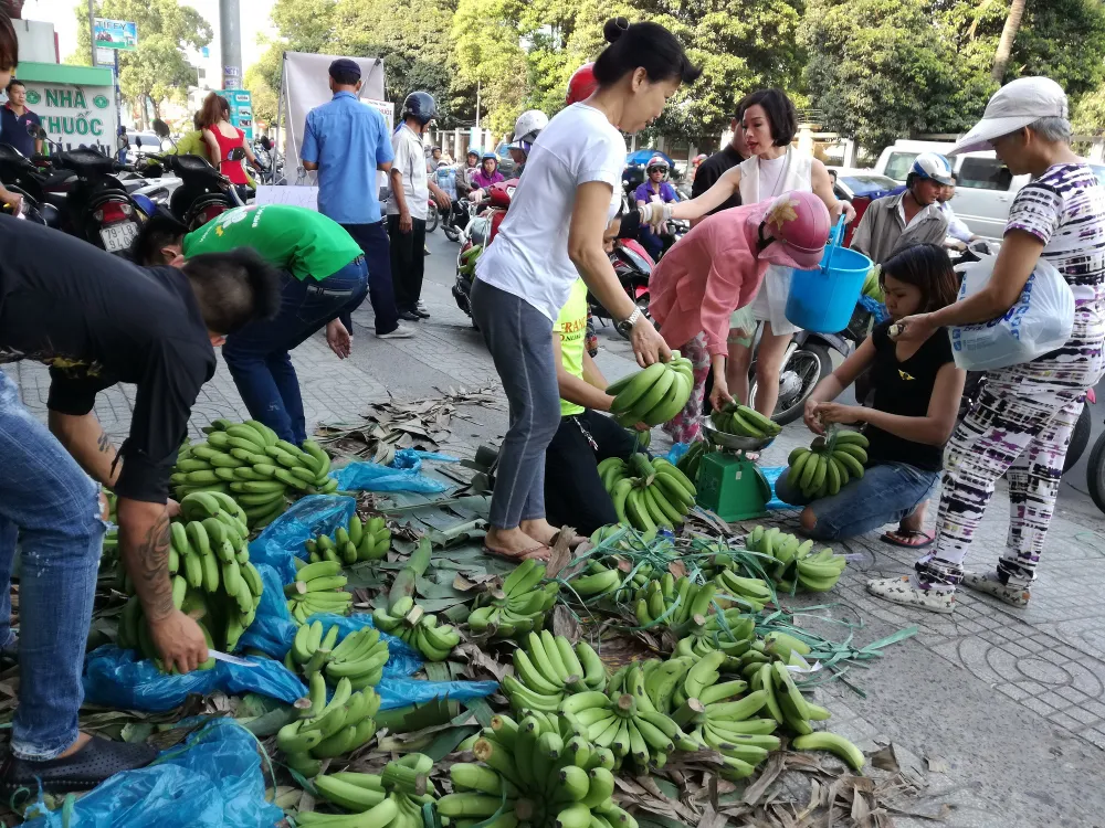 Chiều 8-3, nhiều người đi qua đi lại 23-25 Nguyễn Kiệm, quận Gò Vấp bị thu hút bởi gian hàng bày la liệt những nải chuối xanh “giúp đỡ nông dân Tây Ninh”. Không ít người mồ hôi nhễ nhại cố gắng chen khỏi dòng xe cộ đang lưu thông để kịp mang về vài nải chuối ủng hộ người nông dân. Được biết số chuối được các bạn trẻ thu mua từ nông dân Tây Ninh để đem về bán lại cho người dân TP trong vòng ba ngày nay.