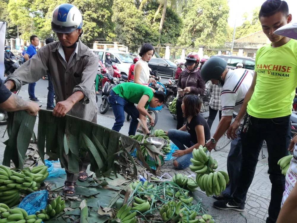 Không những mua nhiều người còn xắn tay phụ giúp bán chuối.
