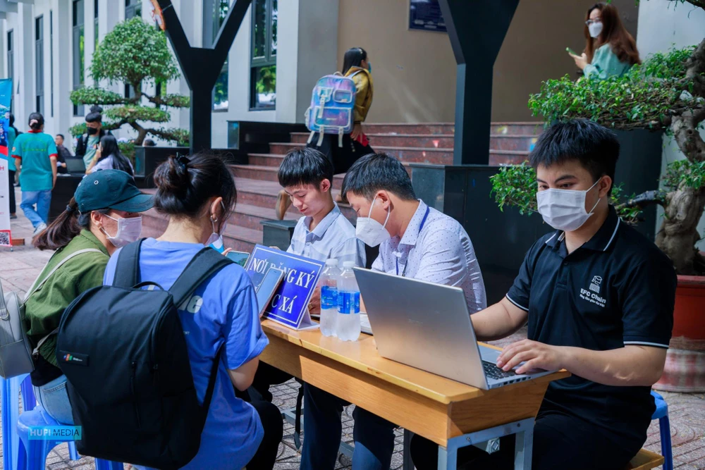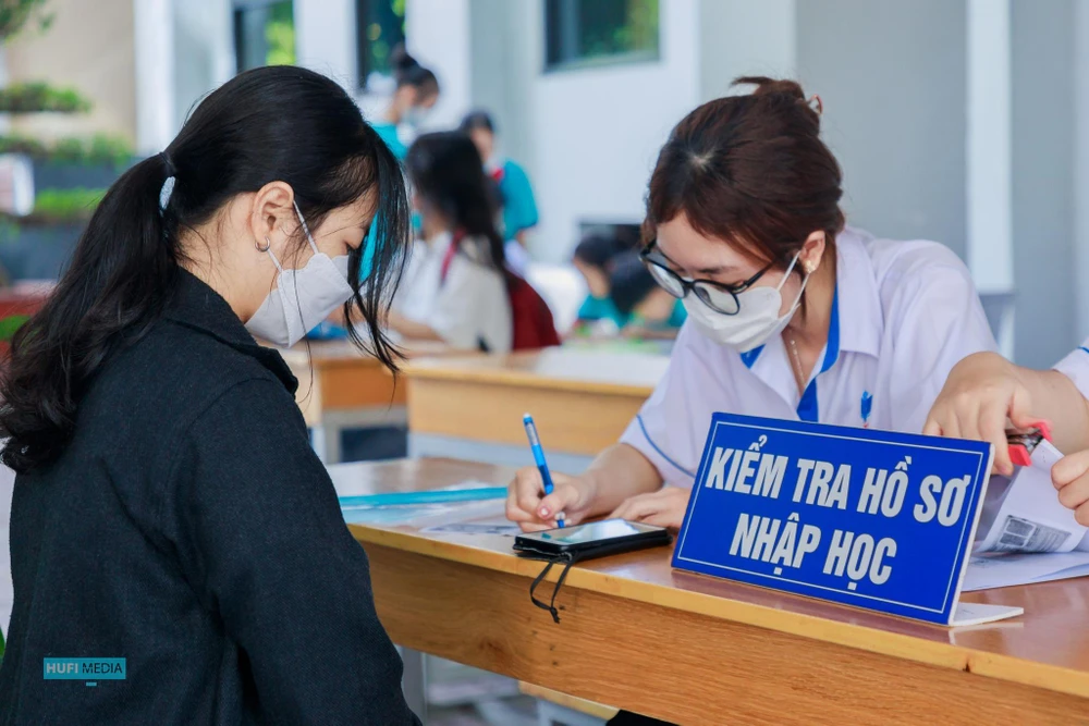 Thí sinh đang được hướng dẫn làm thủ tục nhập học tại Trường ĐH Công nghệ TP.HCM |