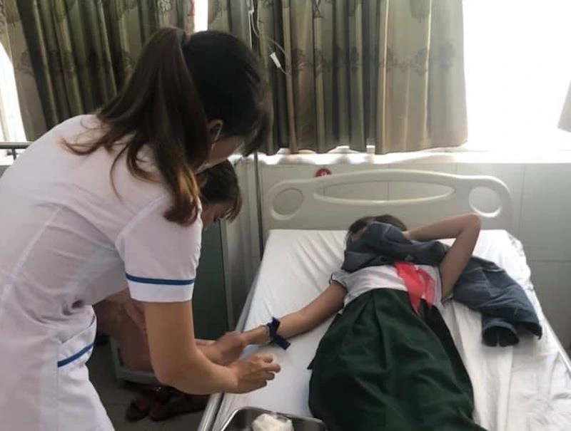 Trước đó, khoảng 11 giờ cùng ngày, 16 em này được chuyển vào cấp cứu tại Trung tâm Y tế huyện Thăng Bình. Khi nhập viện, các em đều có triệu chứng đau bụng, nôn mửa.