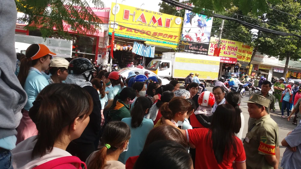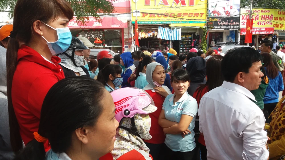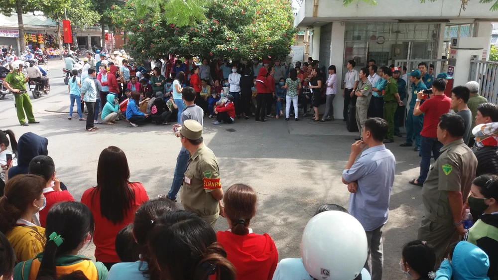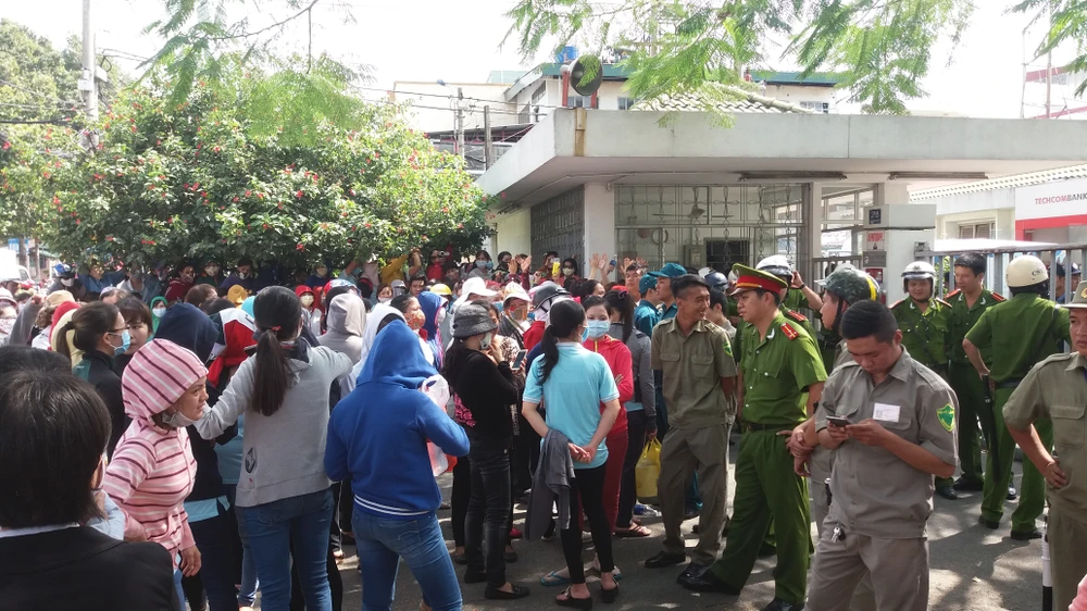 Rất nhiều công nhân đã kéo đến trước cổng của công ty thuộc chi nhánh ở Thủ Đức sau khi đã tập trung tại công ty ở Bình Dương để tiếp tục phản đối. ẢNH: THANH TUYỀN