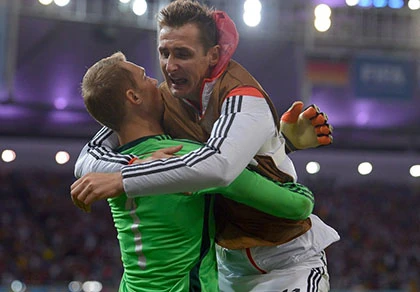 Klose ăn mừng chức vô địch thế giới với thủ thành Neuer.