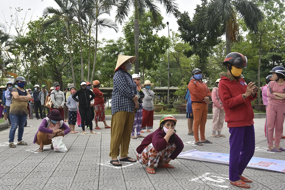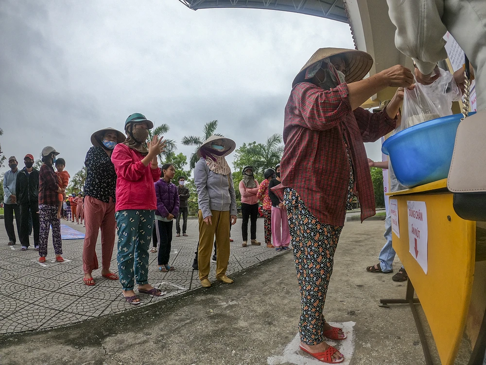 Đảm bảo khoảng cách, đơn vị phát gạo đã vạch ra những ô để người dân đứng đợi. Lực lượng chức năng địa phương cũng tham gia hướng dẫn người dân. Ảnh: NGUYỄN DO