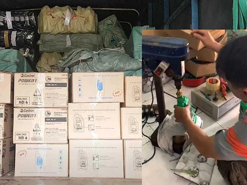 Thâm nhập vào bên trong căn nhà, chúng tôi ghi nhận cảnh chiết nhớt từ bồn ra bình nhớt đã qua sử dụng và dùng máy dập nắp, dán tem các loại nhớt có thương hiệu nổi tiếng. Chúng tôi xác định đây là cơ sở sản xuất nhớt giả khép kín, nguyên liệu là nhớt thải được nấu lên, sau đó dùng hóa chất đánh trong, cho màu vào tạo thành nhớt giả.