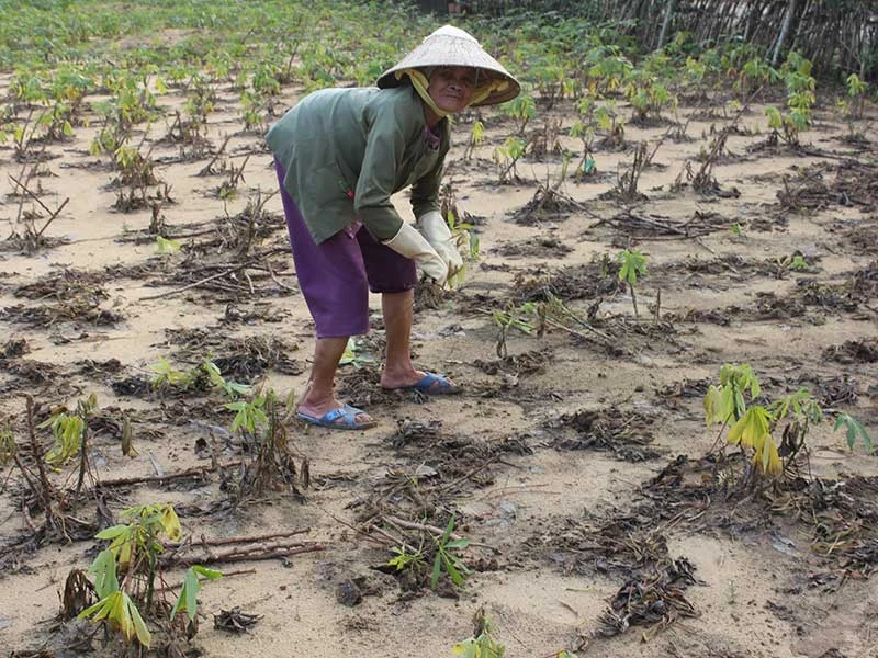 Tại thôn Đạm Thủy Nam, xã Đức Minh, nhà dân, ruộng mía, nghĩa địa vẫn đang chìm trong nước úng... Cụ Phạm Thị Đỡ còng lưng nhổ những cây mì thối rễ, thở dốc: “Con người cũng chịu không nổi huống chi cây mới trồng. Cả đám mì cây chết hết rồi”.