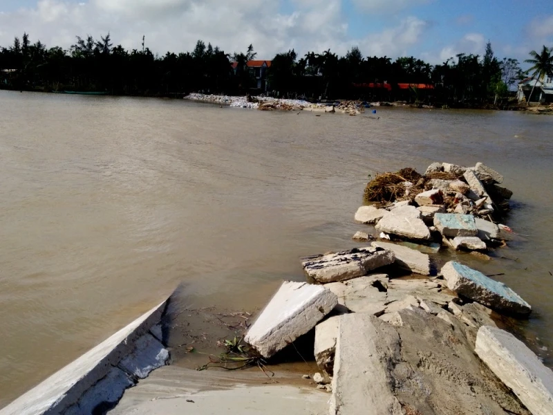 “Đó, mấy anh cứ nhìn ra đằng kia, phía ngoài chỗ mấy chục bao cát ấy, sẽ thấy một khoảng sông nước mênh mông, là nơi con đường bị lũ cuốn trôi. Hơn cả tuần nay, hàng trăm người dân chúng tôi phải đợi đò mỗi khi có việc cần…” - một người đàn ông nói.