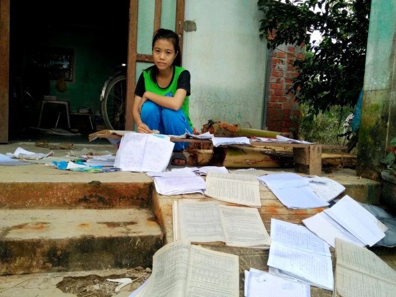 Em Lê Thị Thảo (lớp 12 Trường THPT Nguyễn Trãi, TP Hội An) cho biết do chạy lũ gấp, em không kịp gom sách vở. Khi lũ rút trở về thì toàn bộ sách vở ngâm nước bị hư gần hết, Thảo phải học nhờ sách vở của bạn.