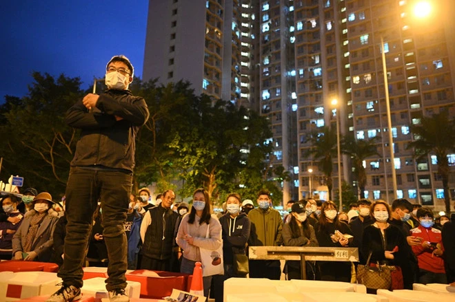 Người dân tập trung trước tòa nhà ở khu Phấn Lĩnh phản đối chính quyền Hong Kong chuyển đổi nơi này thành cơ sở cách ly dịch bệnh. Ảnh: AFP