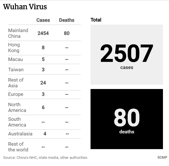 Số ca nhiễm virus Corona đến nay đã là 2.507 với 80 ca tử vong. Đồ họa: SCMP