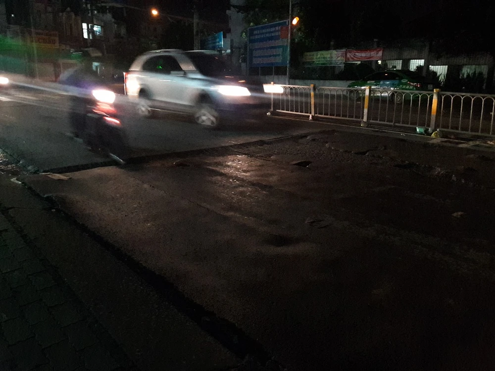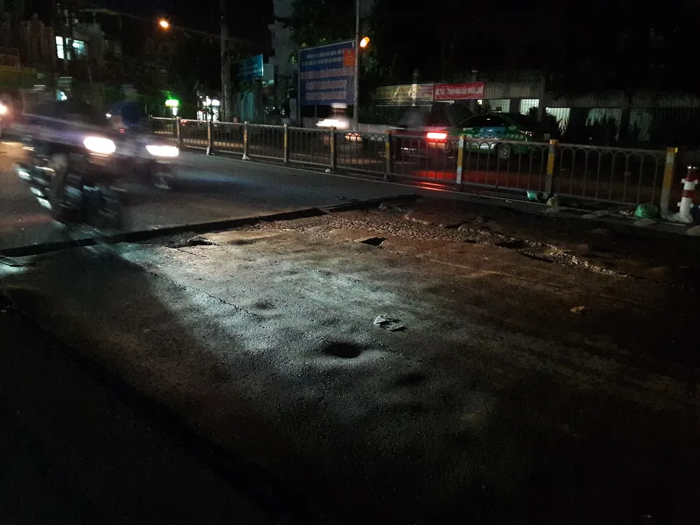 Nhiều ổ voi, ổ gà trên đường Võ Văn Ngân trước nhà thờ Thủ Đức tối 26-9 ẢNH: HÀ PHƯỢNG