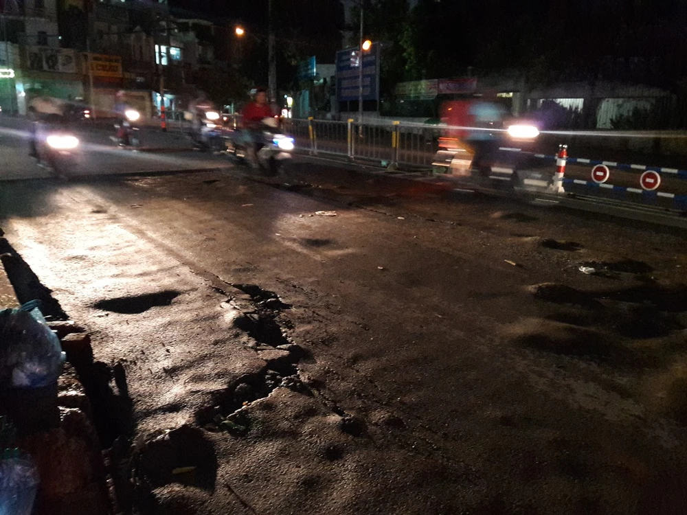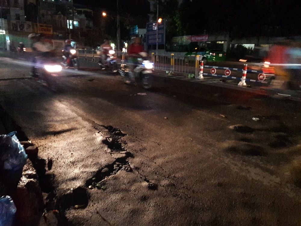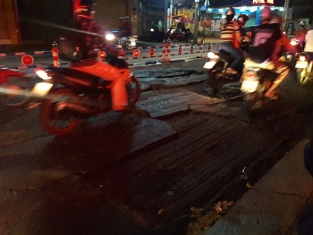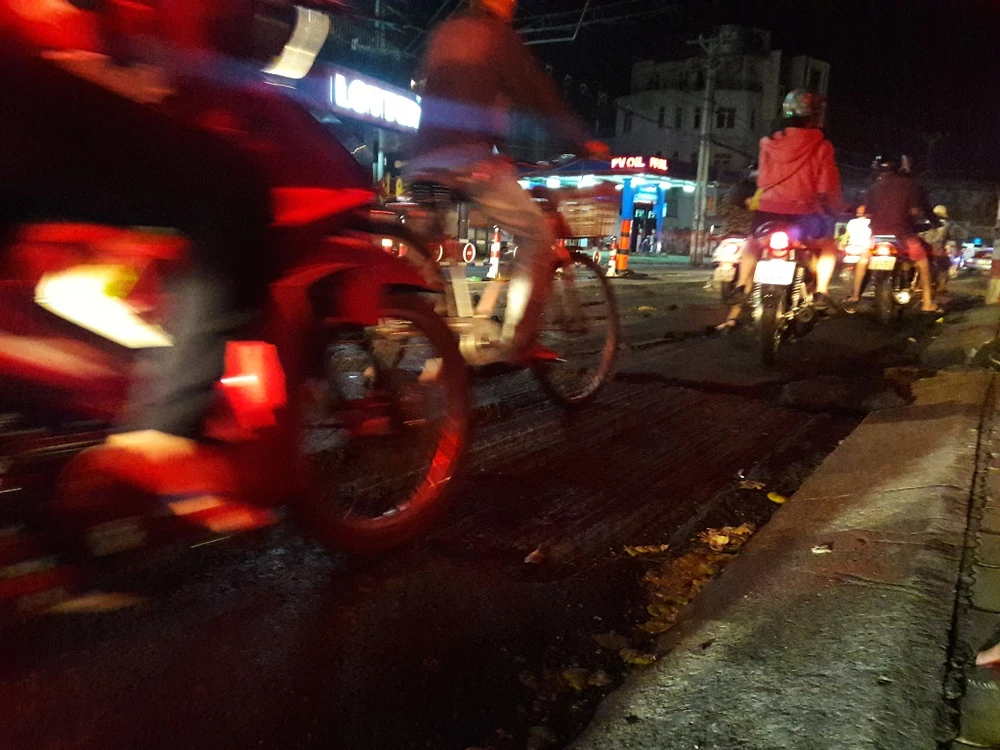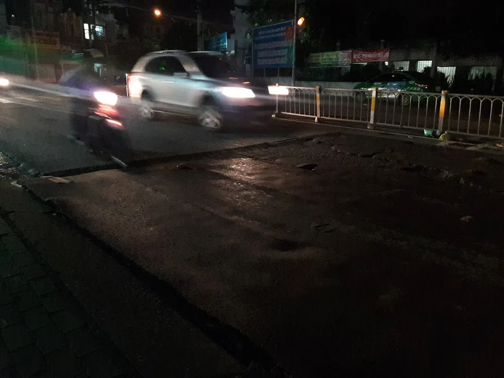 Mặc dù đã 23 giờ, lượng xe ít nhưng người dân di chuyển rất khó khăn do đường hư hỏng nặng ẢNH: HÀ PHƯỢNG