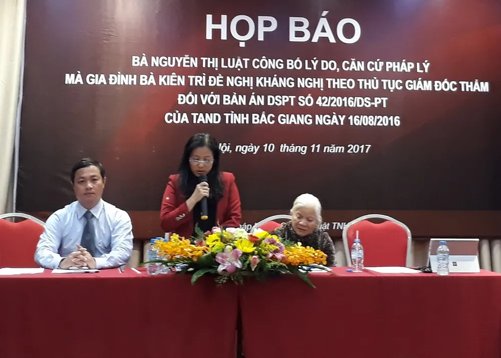 Ngày 10-11, bà Nguyễn Thị Luật (79 tuổi, trú phường Ngô Quyền, TP Bắc Giang, tỉnh Bắc Giang) ủy quyền cho Công ty Luật TNHH Everest tổ chức buổi họp báo với nội dung: Công bố lý do, căn cứ pháp lý mà gia đình bà kiên trì đề nghị kháng nghị theo thủ tục giám đốc thẩm đối với bản án dân sự phúc thẩm của TAND tỉnh Bắc Giang vào tháng 6-2016 vừa qua.