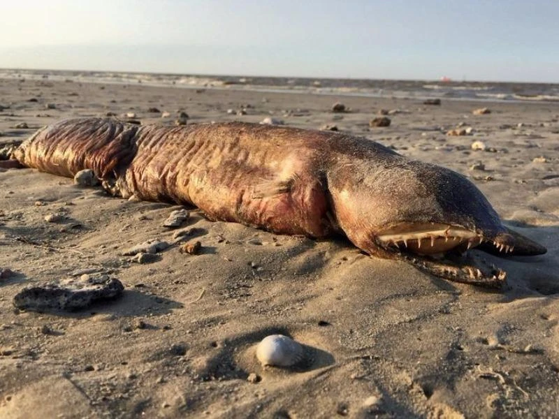 Bức ảnh cho thấy sinh vật biển này không có mặt, răng sắc như dao lam với thân hình trụ tròn.