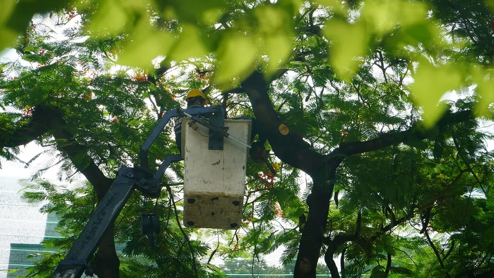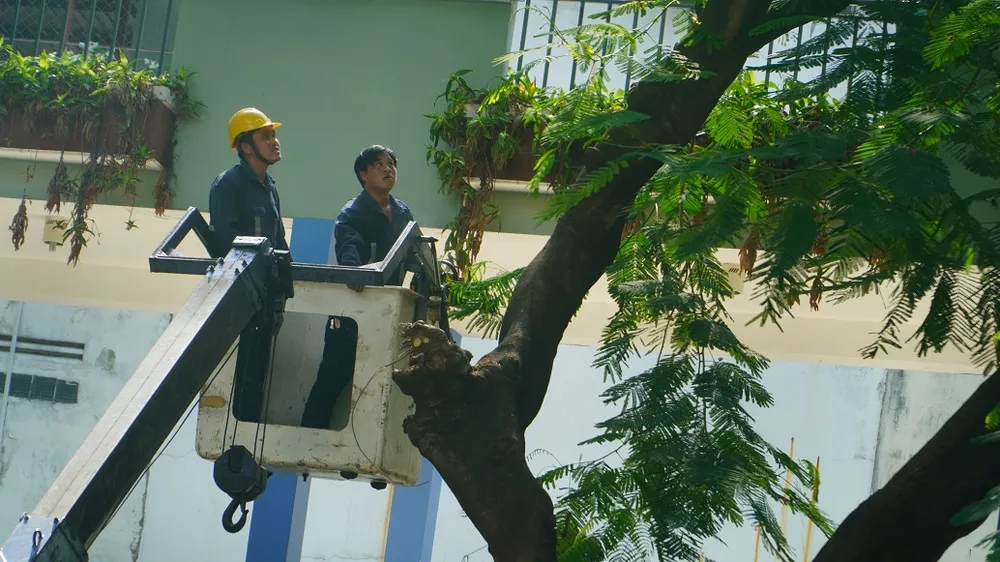 Công nhân Công ty Công viên Cây xanh TP mé nhánh cây phượng. Ảnh: MINH TÂM