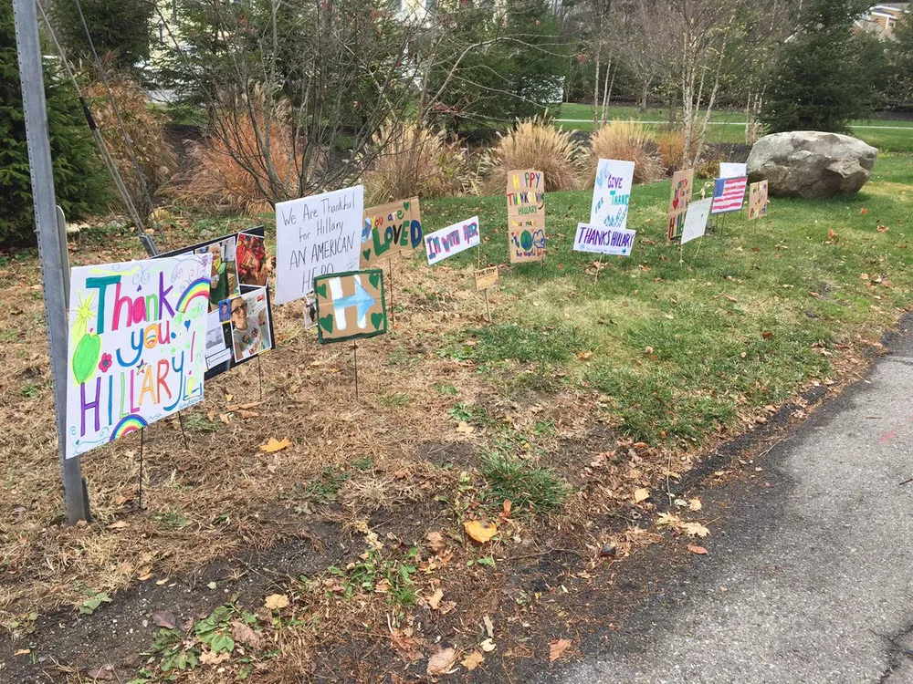 Hôm nay 25-11, bà Clinton đã lên mạng xã hội bày tỏ sự cảm ơn đối với những người luôn ủng hộ bà. Những người này đã đặt các biển hiệu với thông điệp như: “Chúng tôi yêu Hillary Clinton”, “Cảm ơn Hillary”, “Chúng tôi biết ơn Hillary, Anh hùng của nước Mỹ”,… xung quanh nhà của bà ở Chappaqua.
