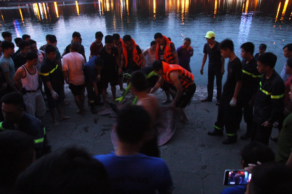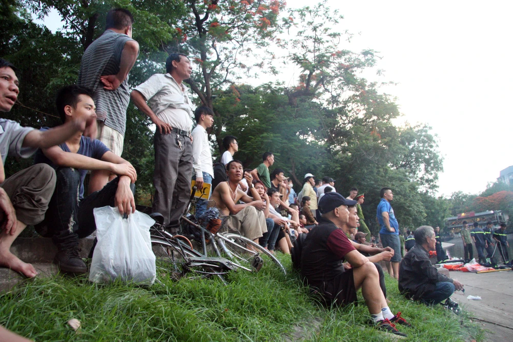 Rất đông người dân đứng ở ven bờ theo dõi vụ việc