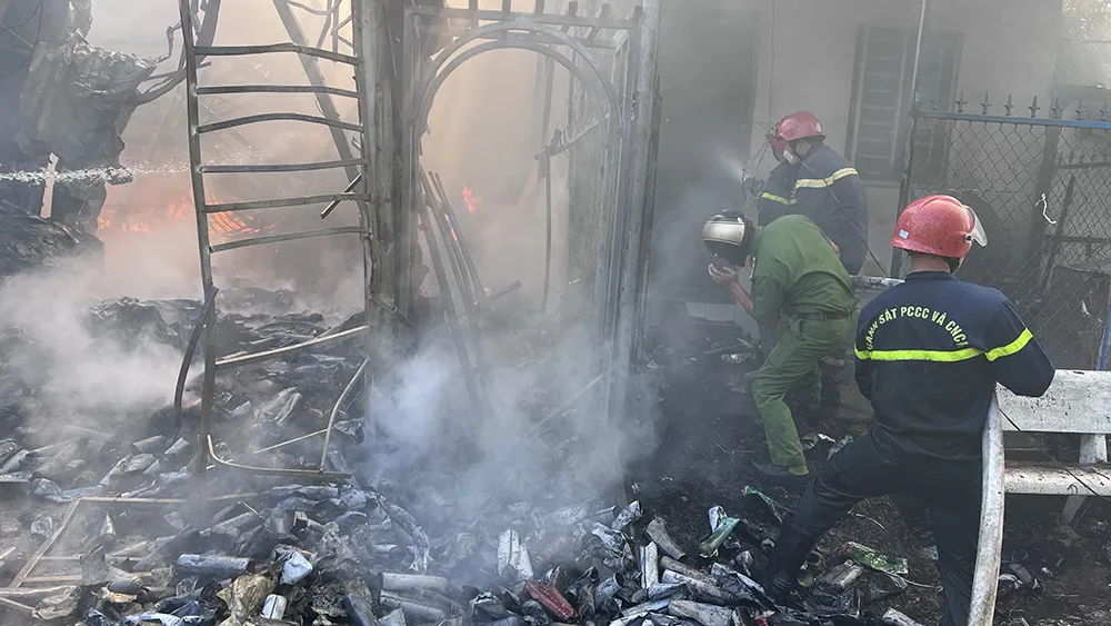 Sau đó, ngọn lửa bùng phát dữ dội và và lan nhanh sang các nhà liền kề. Thời điểm này, nhà kho bị cháy có nhiều bình xịt côn trùng và hàng tạp hóa.