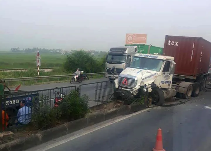 Chiếc xe đầu kéo BKS 15C-09379 bị tông vào giữa dải phân cách sau khi va chạm.