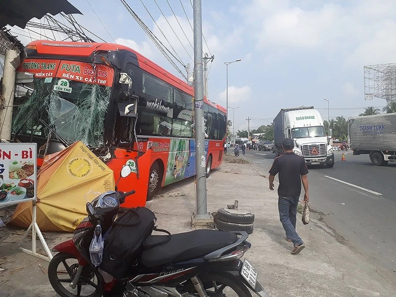 Ngày 19-12, Công an huyện Long Hồ (Vĩnh Long) đang điều tra làm rõ nguyên nhân một xe khách lao lên vỉa hè tông gãy trụ điện sau va chạm với hai ô tô khác.