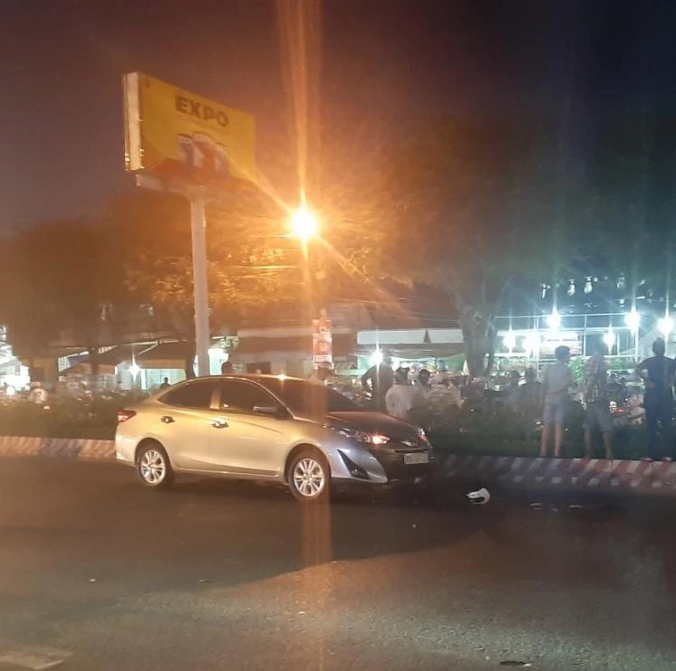 Cú va chạm khiến chiếc xe máy đâm vào dải phân cách đường. Một thanh niên ngã xuống đường, người còn lại bị hất bay qua phần đường chiều ngược lại. Đúng lúc ô tô 65A-187.01 chạy tới và tông vào người này.