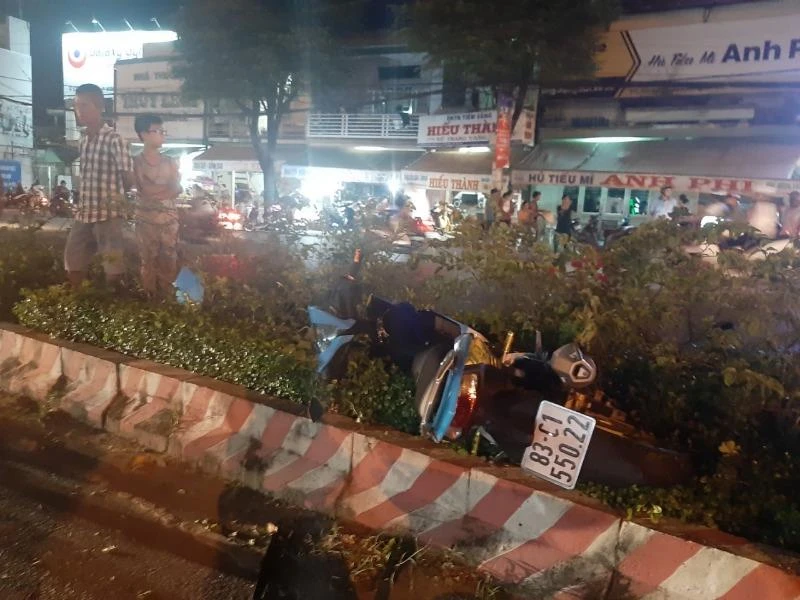 Tại hiện trường, chiếc xe máy bị hư hỏng nằm gọn trên dải phân cách.