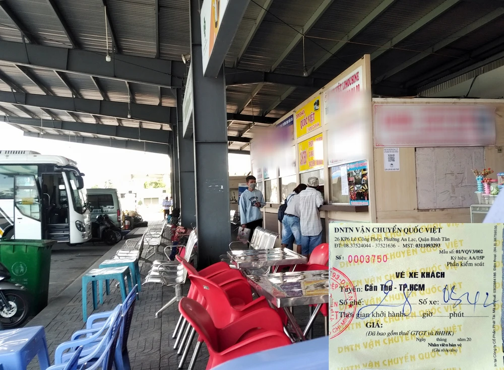 Phòng bán vé xe của nhà xe Quốc Việt bên trong bến xe trung tâm TP Cần Thơ (ảnh lớn) và vé xe tuyến Cần Thơ – TP.HCM (ảnh nhỏ). Ảnh: CHÂU ANH